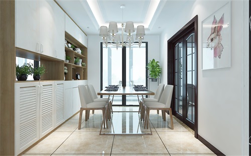 木质的长方形餐桌设计搭配白色的椅凳,餐厅旁边整面墙柜设计以开放式和封闭式为主设计,白色的柜体设计美观又大方,餐桌右边是厨房的位置,厨房用玻璃门做了隔断防止油烟进入。
