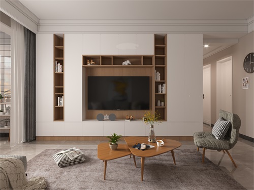 由于户型面积偏小所以在客厅墙的设计上充分把空间都利用上做了一整面的收纳墙,在中间部分内嵌镂空放置电视机,四周做展示台面,其它空间都用面板遮挡,白色和木色搭配更显温润气质。