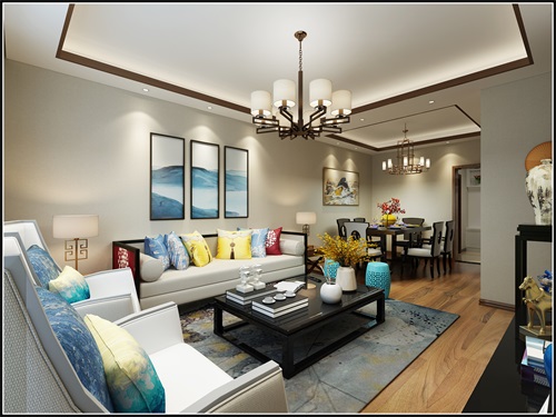 新中式风格设计主要简化中式繁琐的设计但是保留中式元素,客厅整体的框架都是中式元素。